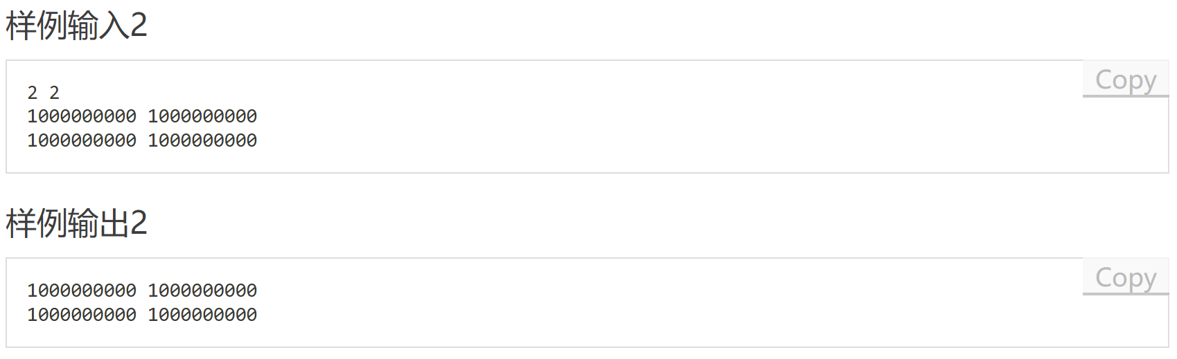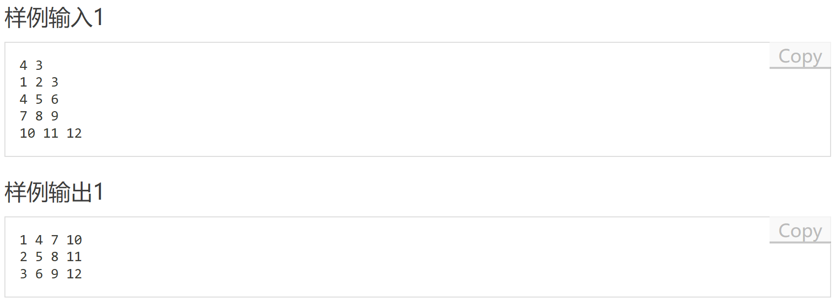 给定一个行列的矩阵。中从上往下第行、从左往右第列的元素为。定义为一个行列的矩阵,其中从上往下第行从左往右第列的元素等于。也就是说,是的转置矩阵。请 输入 输出。
