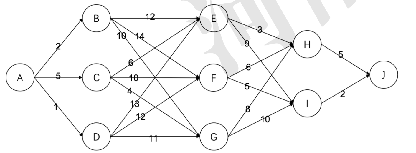 - 有如下的有向图,节点为 A,B,⋯,J, 其中每条边的长度都标在图中。则节点 A到节点 J的最短路径长度为( )。